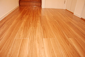 廊下の床に使用している材料はフロアタイルと呼ばれる商材です。厚みは2.5mmほどですが、その見た目や質感は、フローリング材と見分けがつかない程です。自然な仕上がりで統一感も申し分ありません。