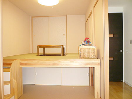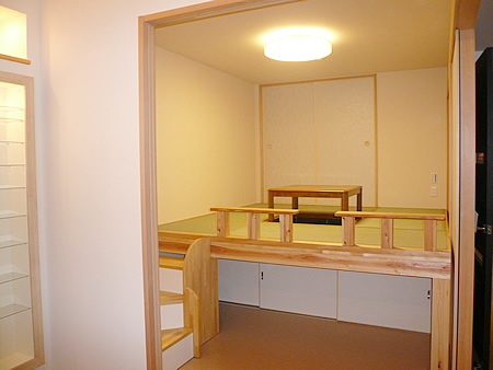 6帖ある和室の中に4帖のロフトを造作しました。既存の襖は撤去し、ロフト上からの高さで新規で襖を造作しました。ロフト上には掘りごたつを取付、冬は足元もポカポカです♪使わない時は半畳の畳を上から乗せればロフト畳面はフラットに。