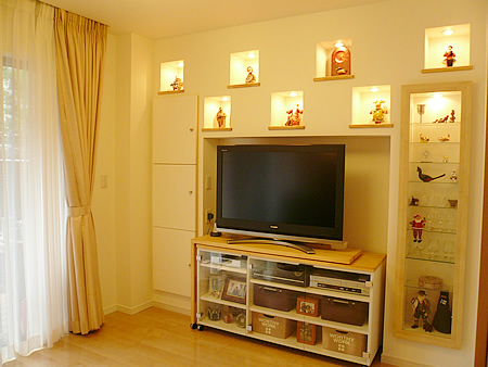 テレビキャビネットは可動式で、テレビの大きさに合わせたカウンターを造作し、中に入れるデッキ類はサイズを測り、将来的なデッキの交換も視野に入れ造作しました。