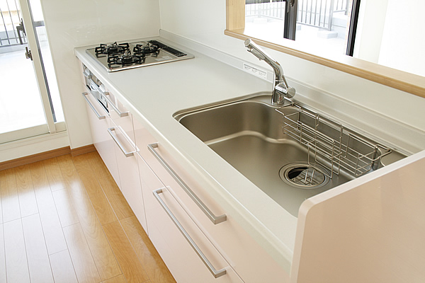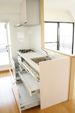 【キッチンのリフォームポイント】 施主様のご要望であった対面式キッチンをどの位置に配置したらベストかを検討しました。眺望が楽しめ、使い易く、リビング全体が見渡せるこの場所をご提案致しました。 特に背面スペースには十分なゆとりをもたせ、キッチンからもバルコニーへ出られるように考慮致しました。 大きなマッサージチェアを置く予定でしたので、ダイニングテーブルにも使用できるカウンターを設置し、食事スペースとしても使用できるように致しました。