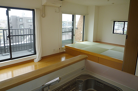 【リビングルームのリフォームポイント】 4.5畳・4.5畳・6.7畳と小さく区切られた既存の間取りを全て繋げリビングルームにしました。 ただ、もう一部屋欲しい・・・となった時にリビングとは完全に独立したお部屋を造れるような畳が丘と可動式間仕切りを使用したプランをご提案しました。リビングには施主様がお持ちの大型家具類も無理なく置けるよう計算された空間となっています。 又マンション最上階という眺めの良さを最大限活かせるよう考慮致しました。